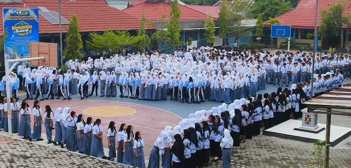 Ratusan siswa, guru, dan tenaga kependidikan SMAN 1 Sampit mengikuti kegiatan Halal Bihalal di halaman sekolah dengan suasana penuh kebersamaan.