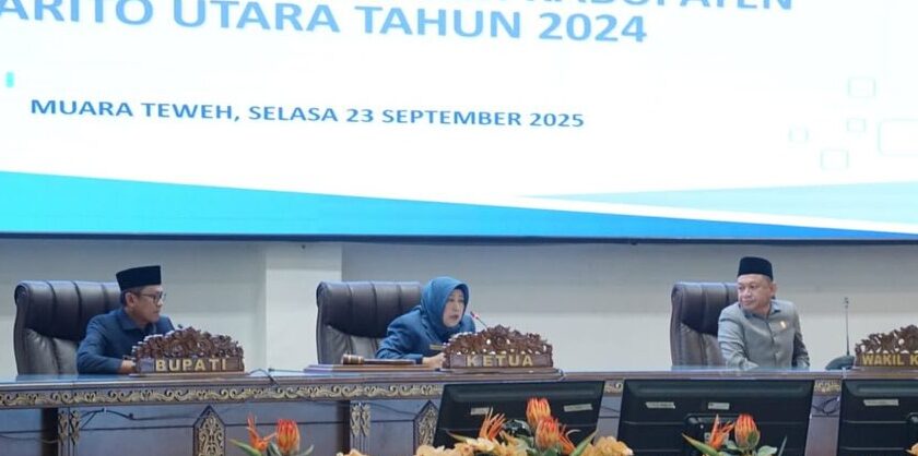 KLIKKALTENG, Muara Teweh – Dewan Perwakilan Rakyat Daerah (DPRD) Kabupaten Barito Utara menggelar Rapat Paripurna Masa Sidang I dalam rangka pengumuman dan penetapan pasangan calon Bupati dan Wakil Bupati terpilih hasil Pemilihan Kepala Daerah 2024, Selasa (23/9/2025).
