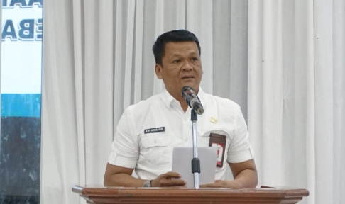 Asisten II Setda Barito Utara B.P. Girsang saat membacakan sambutan Bupati dalam sosialisasi pengadaan tanah untuk rencana pelebaran jalan di Kota Muara Teweh.